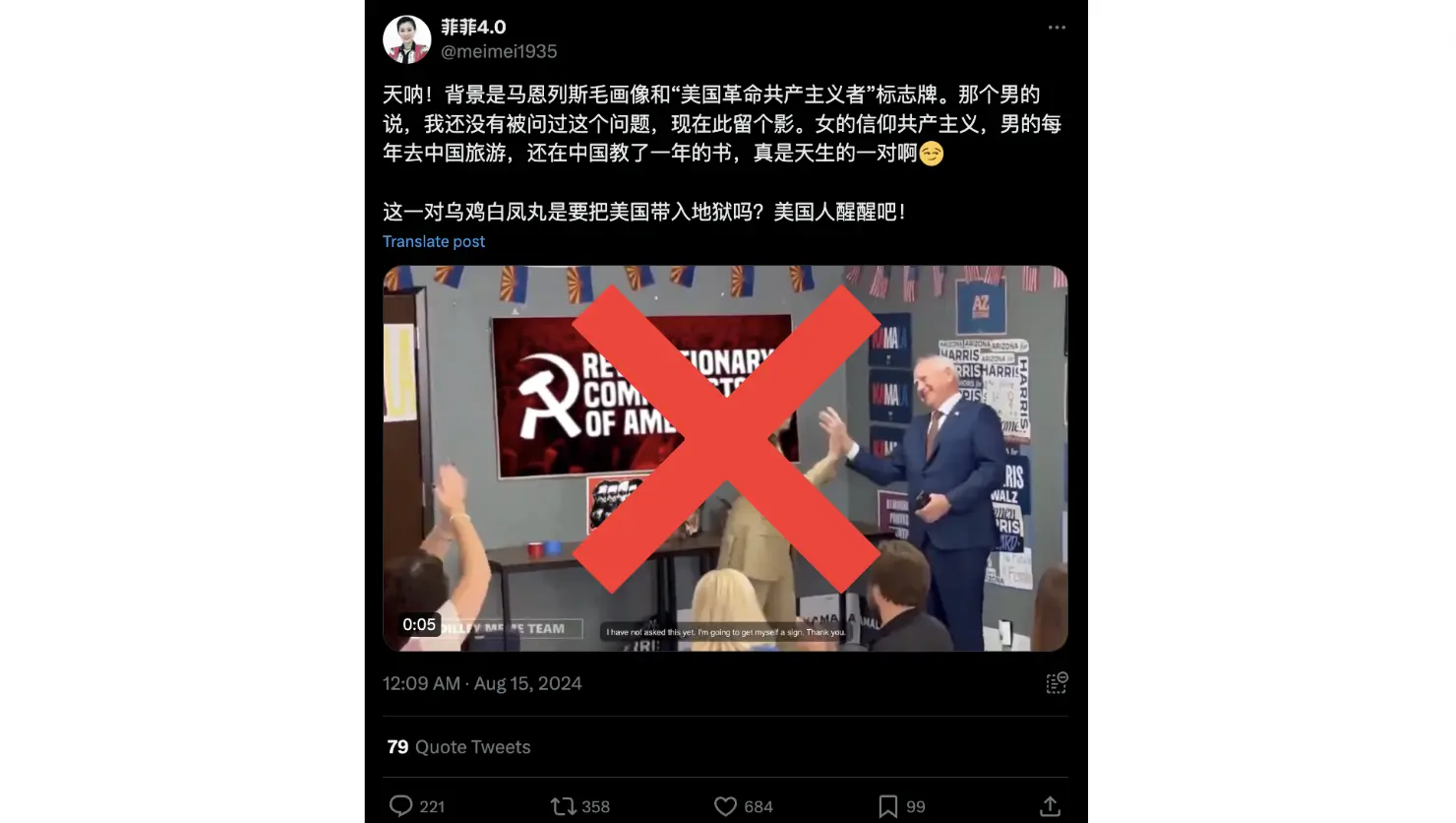 一则于8月14日发布在X的视频配文指,哈里斯和沃尔兹在共产主义组织“美国革命共产主义者(Revolutionary Communist Party)”标志牌前自拍,其背景中还有一张带有马克思、恩格斯、列宁、斯大林和毛泽东等共产主义领袖的象征性海报。