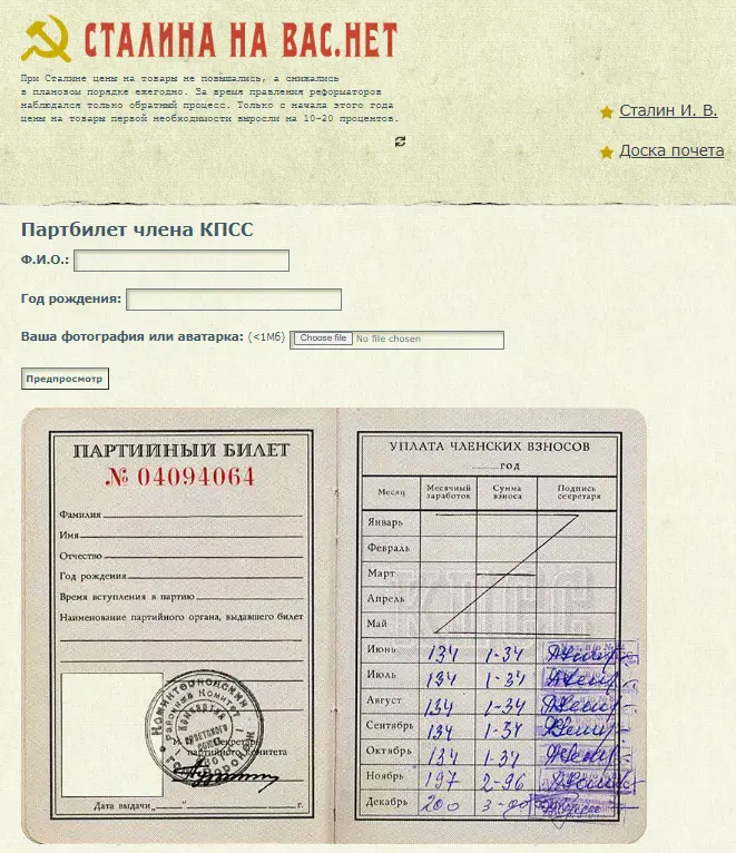 有关说法声称哈里斯1984年收到了这份证件。然后,针对这张照片进行反向搜索和进一步检索,可以发现一个俄语网站Stalinanavas.net可以在线生成类似的“党员证”。
