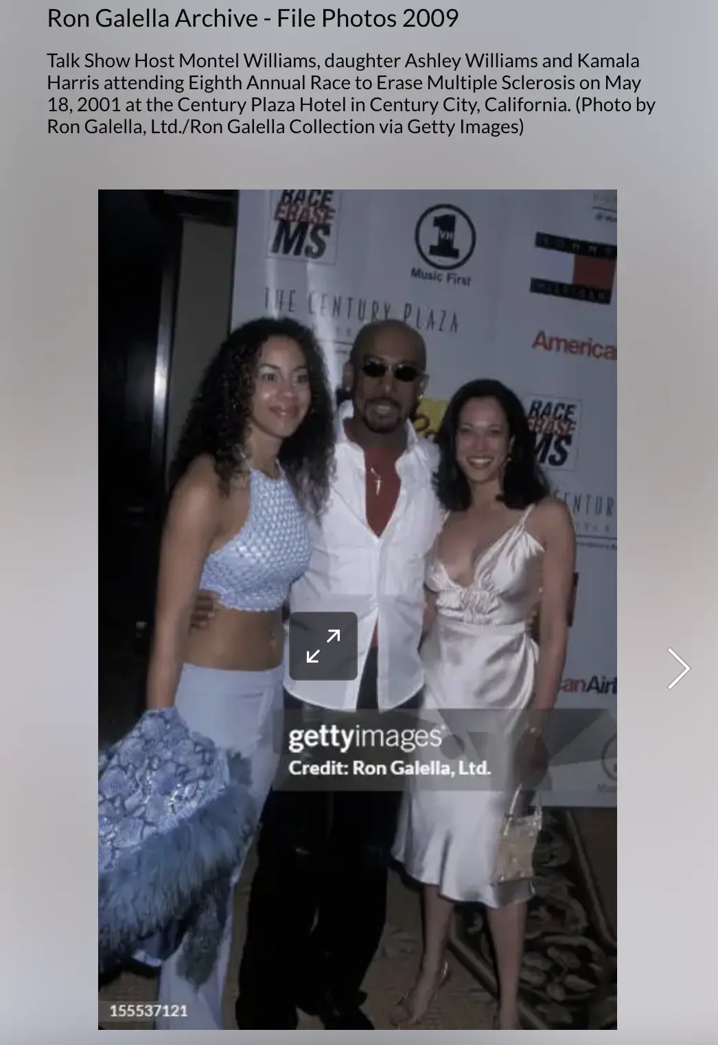 另一张照片的原图则是摄于2001年5月18日,是脱口秀主持人蒙特尔・威廉姆斯(Montel Williams)和女儿与哈里斯的合影。当时,他们一同出席了在加州的一个慈善活动。在社交媒体上分享的图片中,威廉姆斯的脸被替换成了“吹牛老爹”的脸。