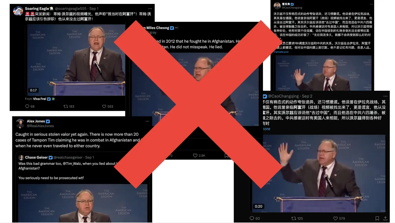 社交媒体还流传一段视频以“佐证”“逃兵”说法,刻意强调沃尔兹在一次演讲中说谎称他“当时在阿富汗”,而他其实并没有去过。多名保守派人士也引用这个视频对沃尔兹提出质疑,亦被诸多中文用户转发分享。